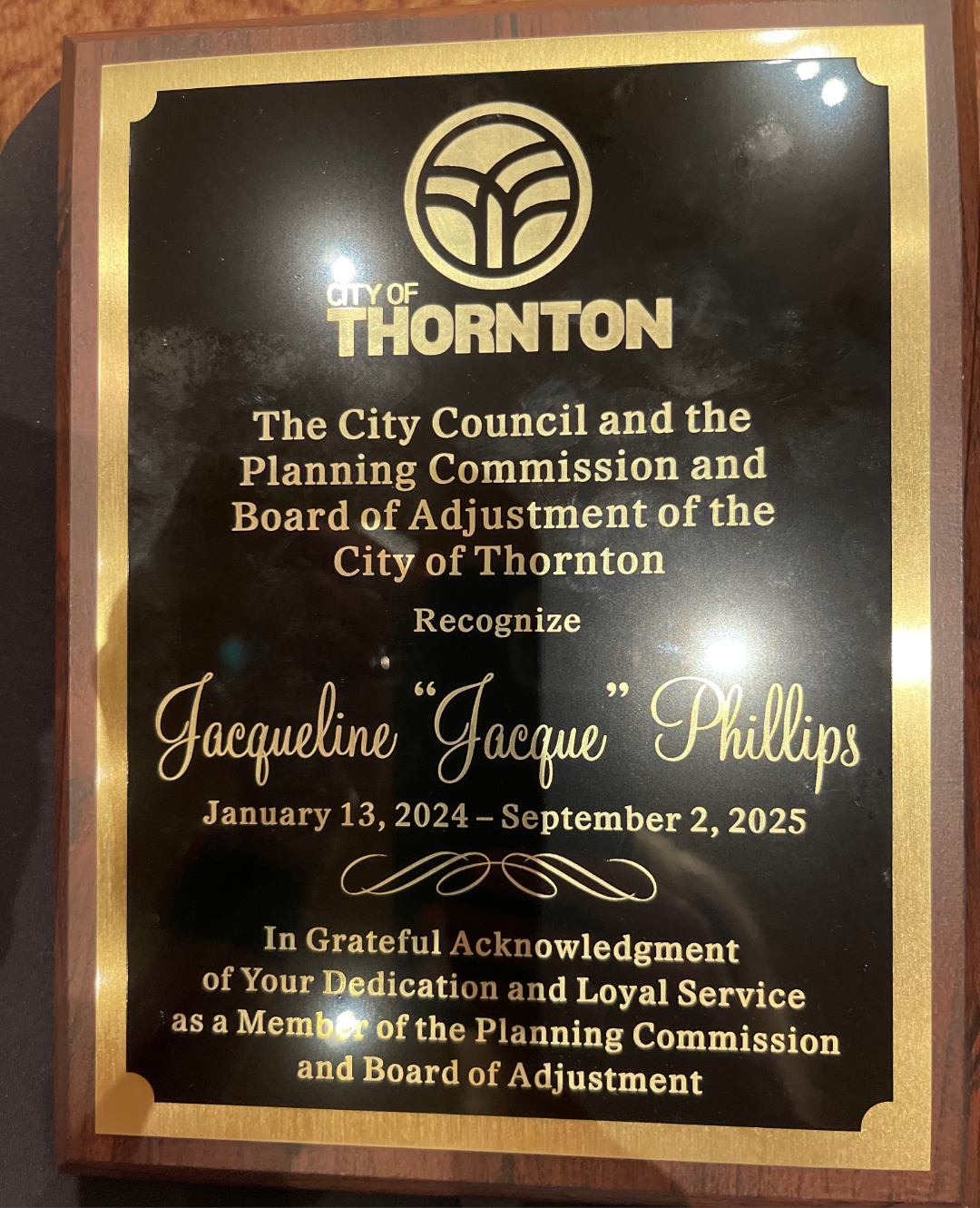 In fact, Jacque has received special acknowledgement by Thornton City Council’s Planning Commission for her continued support in local housing issues where she fought for measures that reduce our local cost-of-living and increase access to safe and affordable housing.